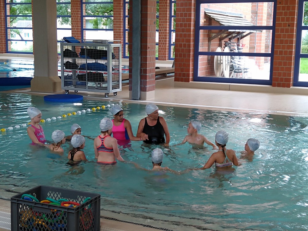 Neu im Programm ist seit diesem Semester der Schwimmkurs. - Von den Teilnehmern wird vorausgesetzt, dass sie sich vertraut fühlen im Wasser. Der Kurs ist für Kinder, die noch gar nicht schwimmen können bis erstes / knappes Schwimmen im Tiefwasser. - Das Training findet vor allem im Nichtschwimmer-Becken, für Fortgeschrittenere auch im tiefen Becken statt.